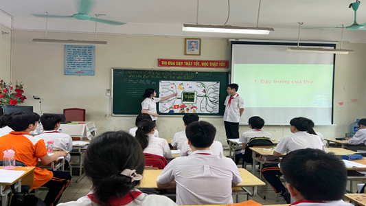 🧠 Tăng cường tư duy qua hoạt động chủ động hóa học sinh: Ở phần tiếp theo, để khắc sâu kiến thức về đặc điểm thể loại thơ và các phương pháp đọc hiểu hiệu quả, cô đã giao nhiệm vụ chuẩn bị từ trước: học sinh vẽ sơ đồ tư duy về đặc trưng thể loại thơ và trình bày trước lớp. Thông qua hoạt động này, học sinh không chỉ được rèn luyện năng lực trình bày và tư duy hệ thống, mà giáo viên còn có cơ hội quan sát, đánh giá năng lực tự học và mức độ nắm bài của từng em – đây là yếu tố quan trọng trong dạy học phát triển phẩm chất, năng lực theo định hướng của chương trình GDPT 2018.