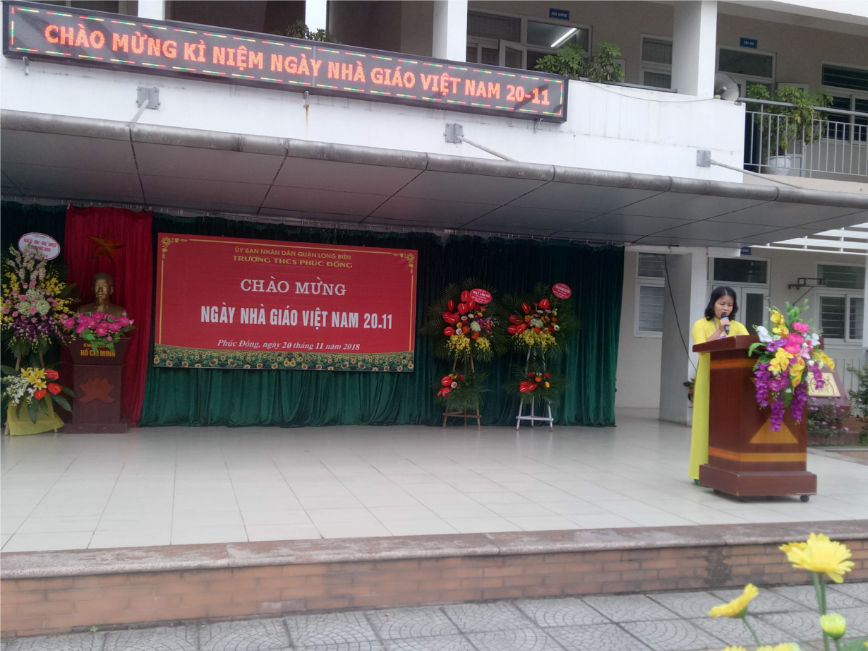 Và để chào mừng ngày Nhà giáo Việt Nam năm nay, trường THCS Phúc Đồng đã có nhiều phong trào thiết thực, thi đua dạy tốt.Nhân buổi lễ, Cô Nguyễn Thị Bích Hồng - phó hiệu trưởng nhà trường thông qua các quyết định khen thưởng cho giáo viên đạt giải cao trong đợt Hội giảng và tập thể lớp đạt thành thành tích cao trong các đợt thi đua chào mừng Ngày nhà giáo Việt Nam.