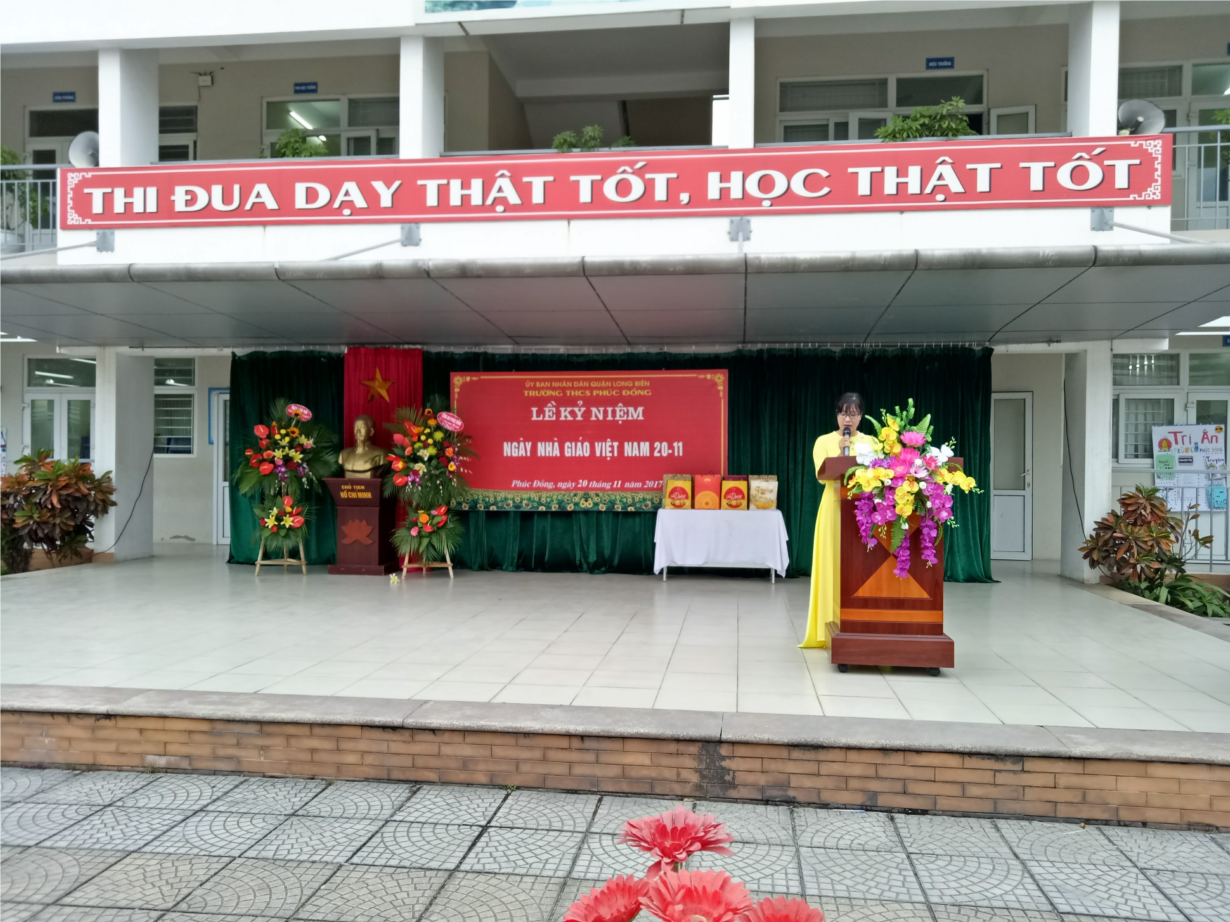 Phát biểu tại buổi lễ, cô Đào Thị Khanh đã ôn lại truyền thống tôn sư trọng đạo tốt đẹp của dân tộc qua các thời kì. Cô Trần Thụy Phương đã báo cáo tổng kế đợt thi đua chào mừng ngày 20.11. Nhiều danh hiệu, phần thưởng đã được trao tặng trong buổi lễ.