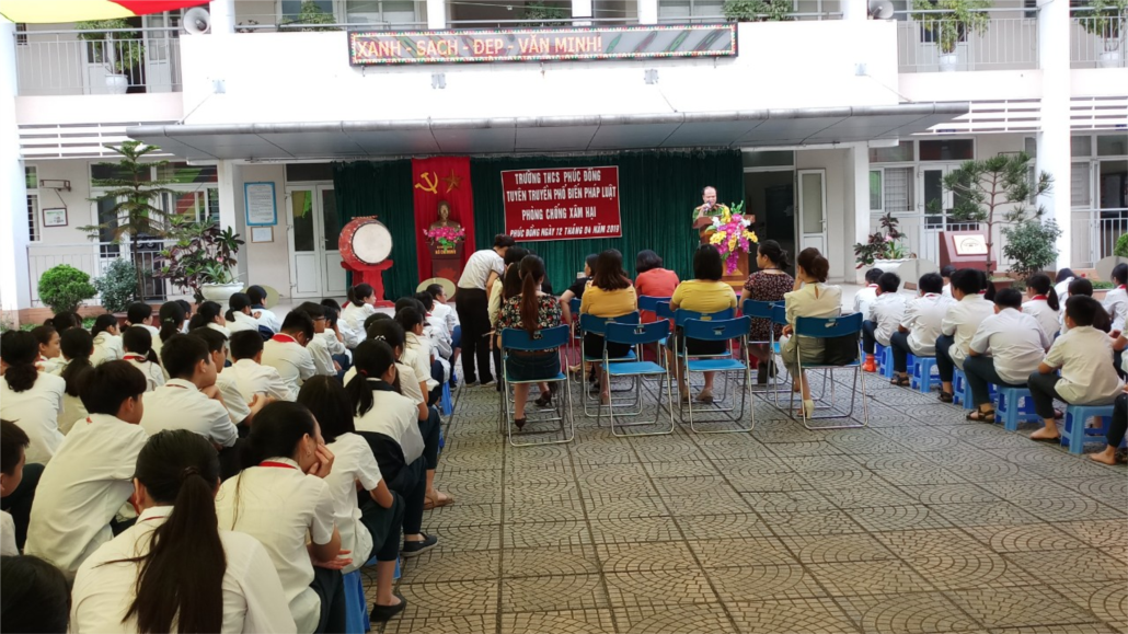 Đến dự và trực tiếp là báo cáo viên tuyên truyền có ông Nguyễn Xuân Hoàng – phó trưởng công an phường Phúc Đồng, phía nhà trường có cô Võ Hương Lam, bí thư chi bộ, Hiệu trưởng nhà trường cùng các thầy cô giáo và gần 500 em học sinh cùng tham dự.