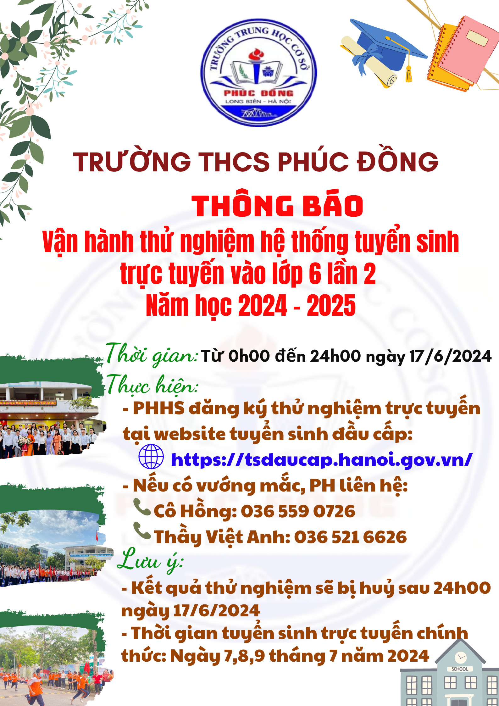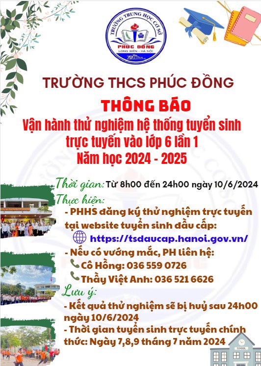 Trường THCS Phúc Đồng thông báo vận hành thử nghiệm hệ thống tuyển sinh trực tuyến vào lớp 6 lần 2 năm học 2023-2024