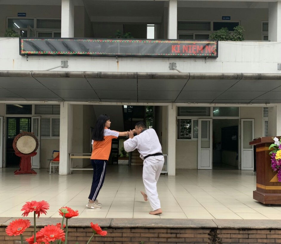 Tiếp đó, thầy Ngô Quốc Thắng đã hướng dẫn cho HS thực hành những kĩ năng để thoát khỏi những hành động xâm hại từ những người xấu: khi bị cầm tay, khi bị ôm từ phía sau, khi bị ôm từ phía trước, khi bị nắm tóc,… Qua bài dạy của thầy Thắng đã giúp cho CB – GV và đặc biệt là HS trong nhà trường có thêm những kĩ năng tự vệ cơ bản để tránh bị xâm hại thân thể.